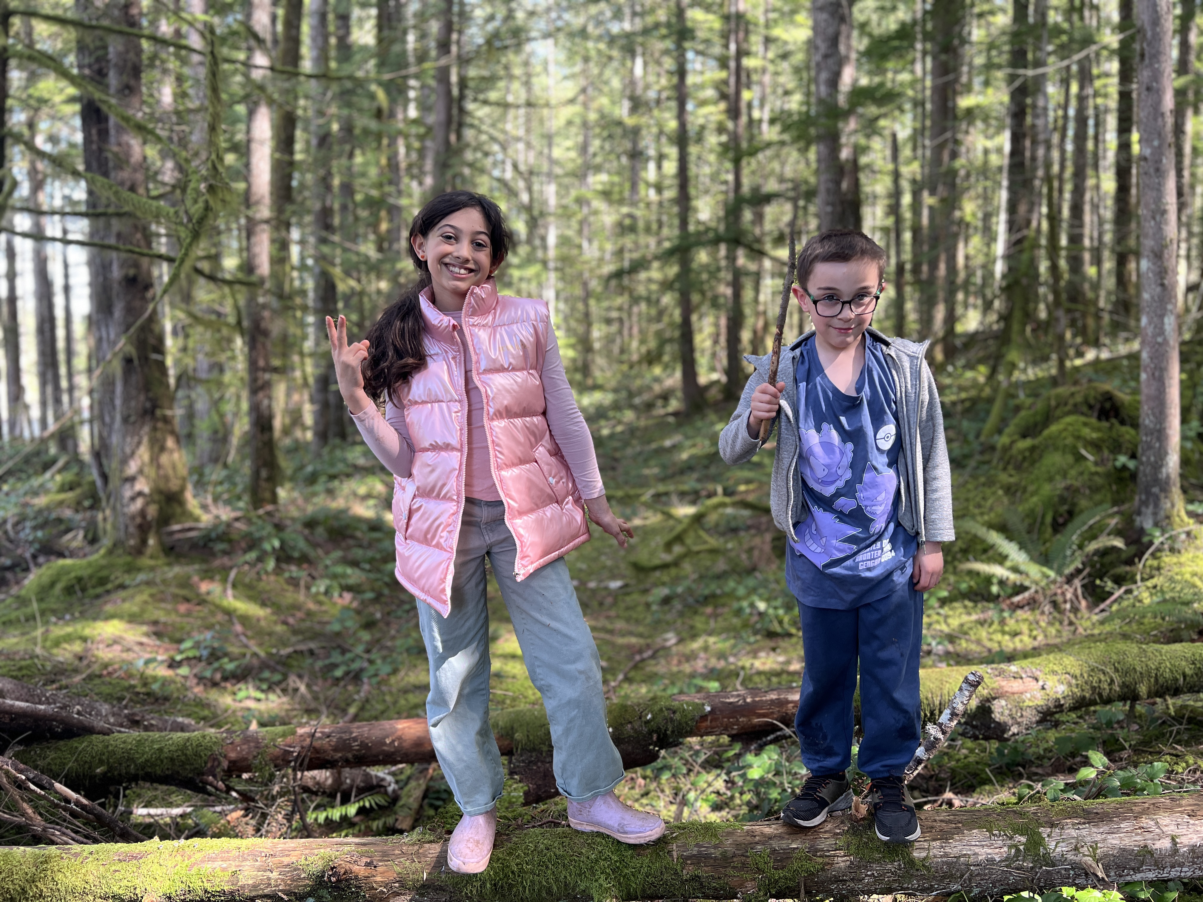 We found this massive fallen tree covered in moss and obviously we HAD to climb on it. Lux found a stick and was pretending to be a wizard and I was giving my signature peace sign. The forest was so magical — there were giant old cedar trees that are like hundreds of years old and their trunks were SO wide I could hide behind them!!