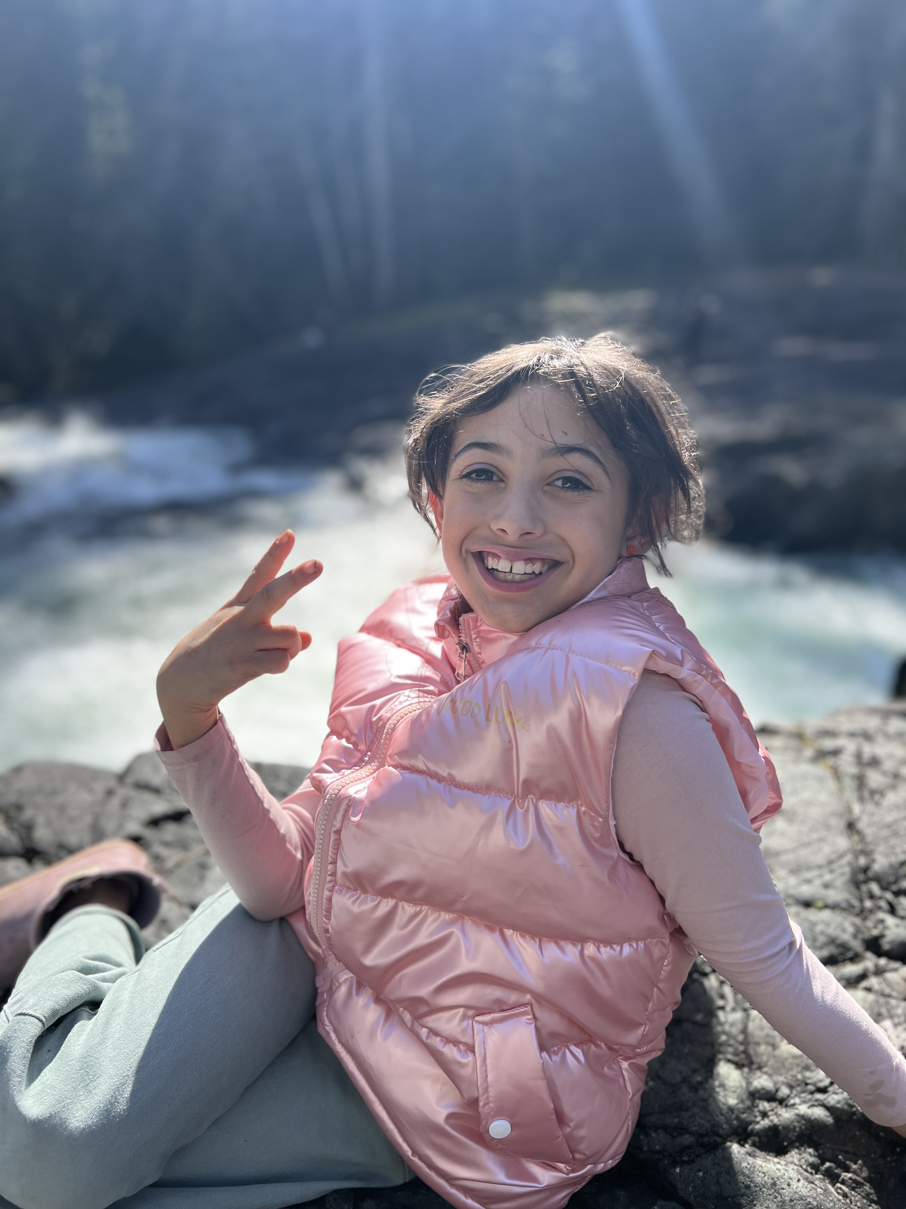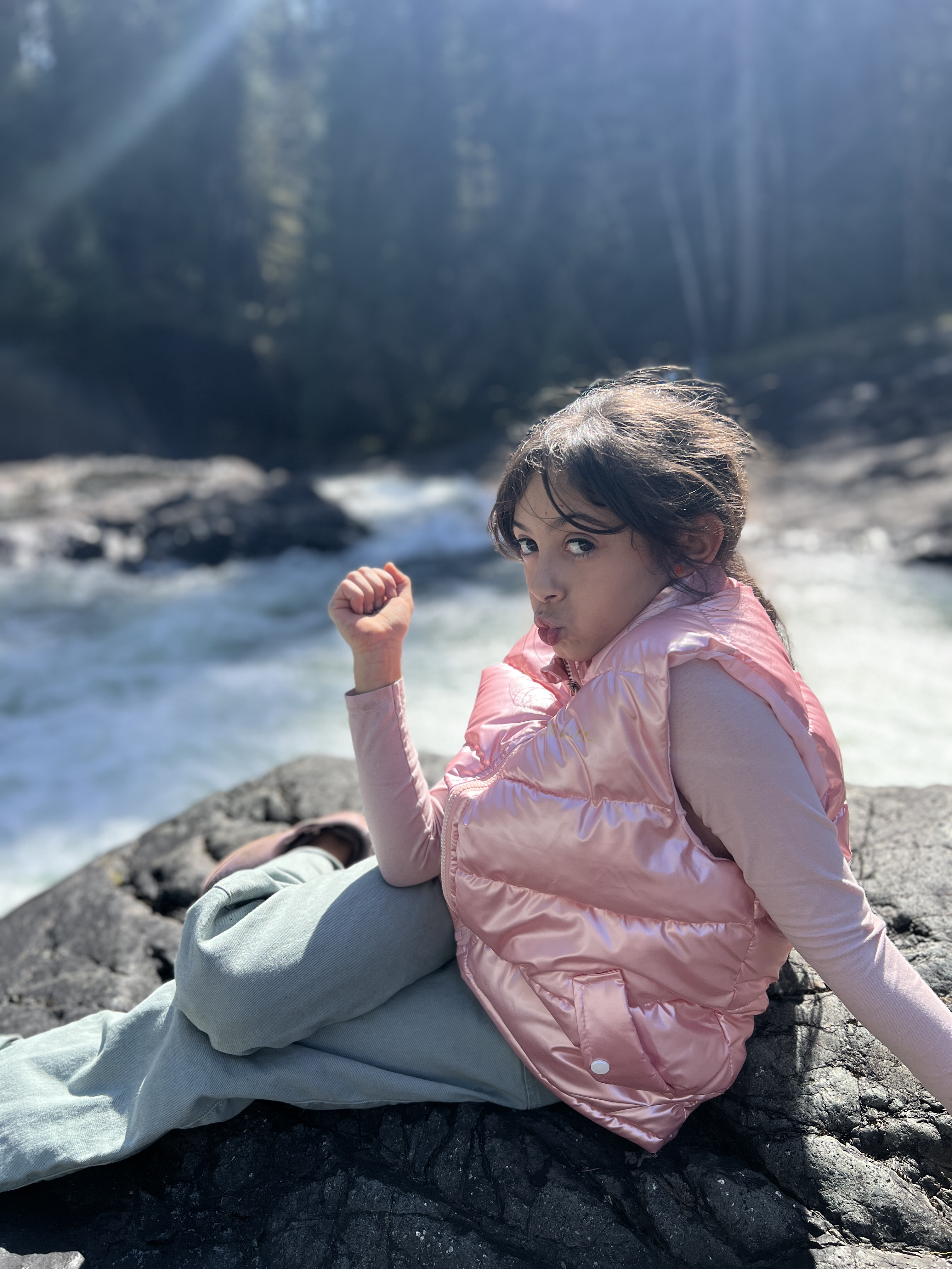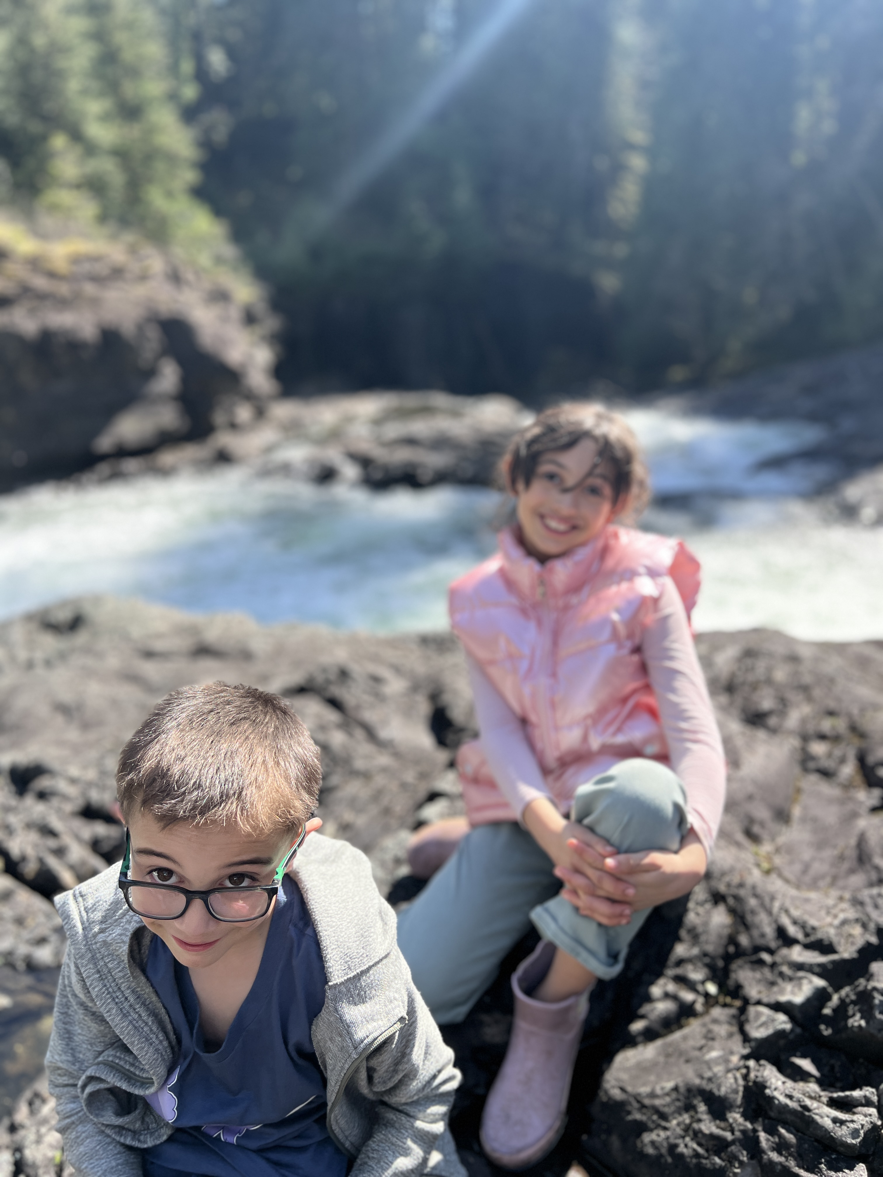 Dad took us down to the rocks right next to the river above the falls and we got to walk right out onto these huge flat rocks. There were little tide pools and mossy patches everywhere and Lux was finding sticks and exploring everything. You could see the water rushing past heading straight for the edge of the falls — it was so wild knowing that all that water was about to drop off a cliff!!