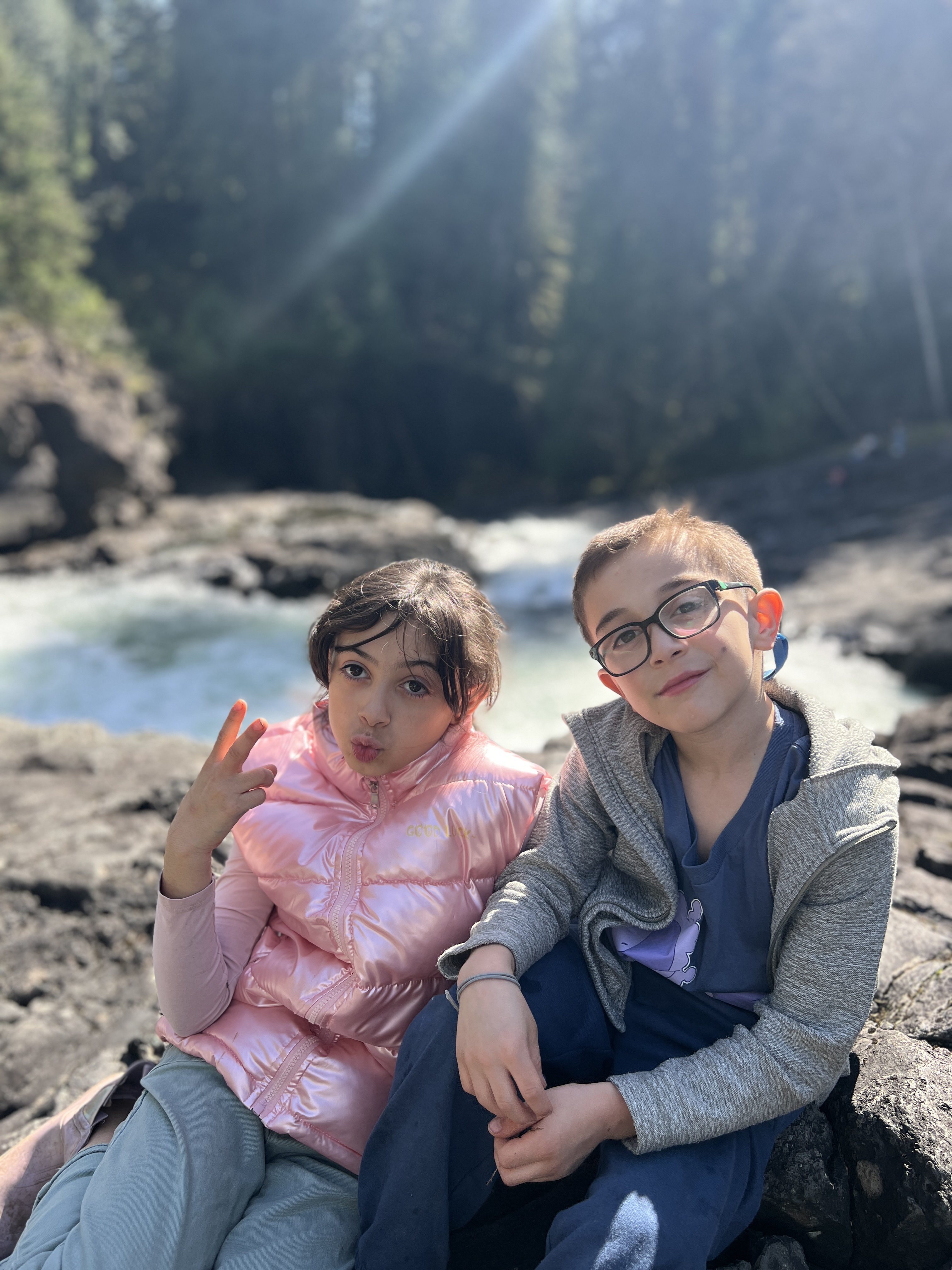 The second we got out of the car we could already HEAR it — this deep rumbling sound coming from the forest. Dad said "that's the waterfall" and me and Lux just looked at each other and SPRINTED down the trail!! He took us to Elk Falls Provincial Park and honestly?? This might be the coolest place I've ever been.